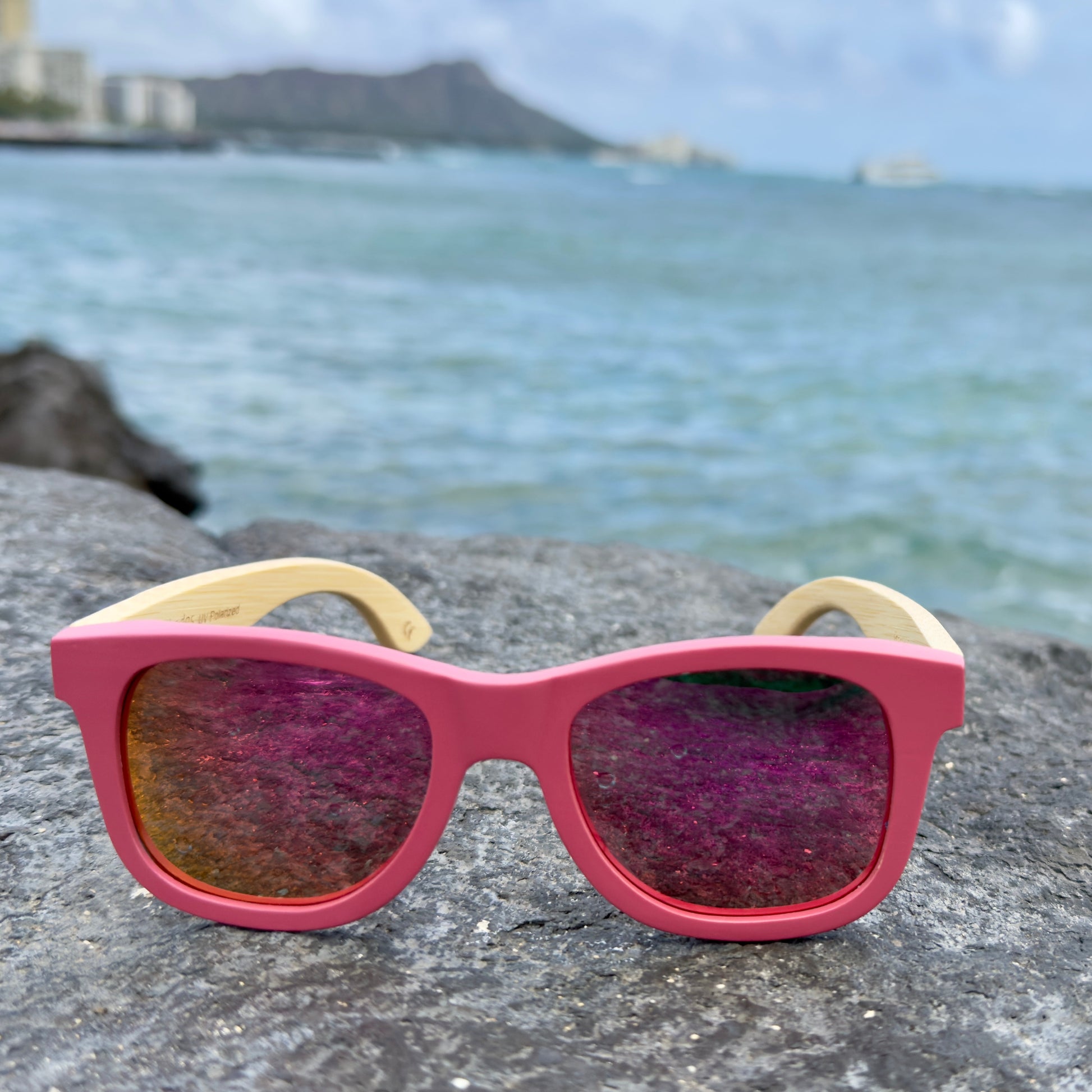 Protect your eyes in style with the Aina Ono polarized sustainable bamboo wood floating sunglasses by Lani Shades. The Lani Shades Aina Ono is an all bamboo Eddie Style for men and women featuring natural bamboo arms and bamboo fronts that are durably dyed Ono, the color of something sweet.